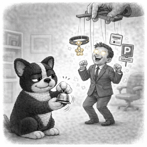 Das Ganze funktioniert wie folgt: Immer wenn man mit dem Belohnungsglöckchen klingelt, muss der Teilnehmer brav Männchen machen. Im Gegenzug bekommt er ein neues Statussymbol: Mehr Leckerchen, ein Halsband oder einen Parkplatz mit Namensschild oder eine eigene Vorzimmerdame. Wenn man das Spielchen lange genug spielt, reicht irgendwann das bloße in Aussichtstellen einer Belohnung und der Kollege macht ganz von alleine Männchen.